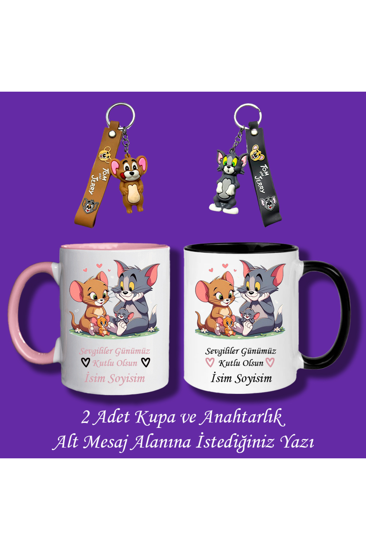 – Sevgililer Günü’nün romantik atmosferini evinize taşıyan Tom ve Jerry temalı kupa bardak seti, sevgilinizle paylaştığınız anları daha da özel kılar.; – Porselen malzemesi sayesinde hem dayanıklı hem de şık bir görünüm sunar; uzun süreli kullanım için idealdir.; – 295 ml hacmiyle günlük içecek ihtiyaçlarınız için yeterli kapasiteye sahiptir; sevgilinizle keyifli sohbetler için mükemmel bir eşlikçidir.; – Anahtarlık seti ile hem işlevsel hem de dekoratif bir hediye alternatifi sunar; sevgilinizin anahtarlarını düzenli tutmasına yardımcı olurken aynı zamanda kişisel bir dokunuş katmanızı sağlar.; – Ürün Seti İçerisinde 2 Adet Anahtarlık ve 2 Adet Kupa Bardaktan Oluşmaktadır.; Sipariş Verdikten Sonra Sipariş Numaranız ile Satıcıya Soru Sor Kısmında Bizimle İletişime Geçerek Yazmak İstediklerinizi İletebilirsiniz.