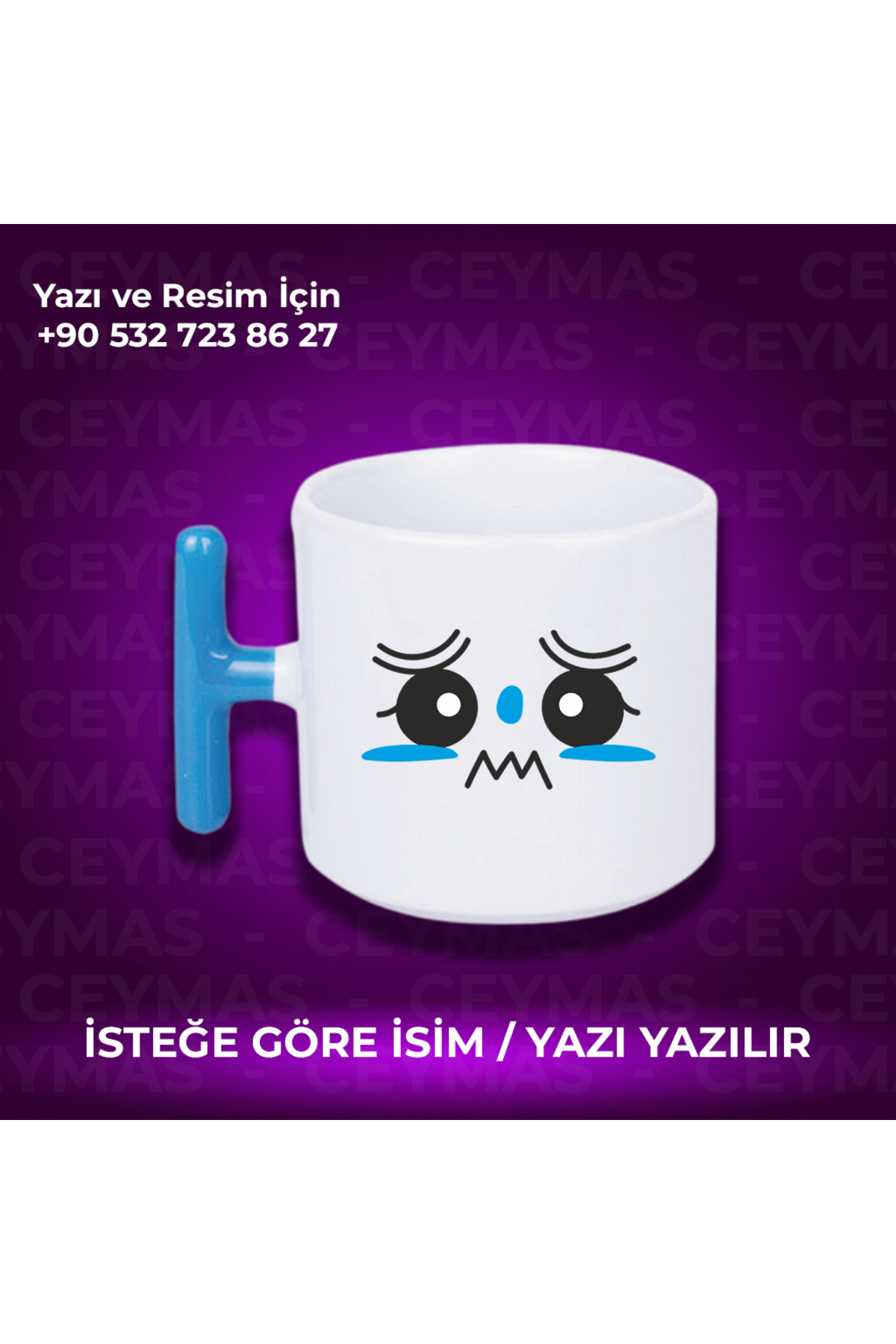 Kişiye Özel Emoji Yüz İfadeli İsim Baskılı Mavi T Kupa Bardak