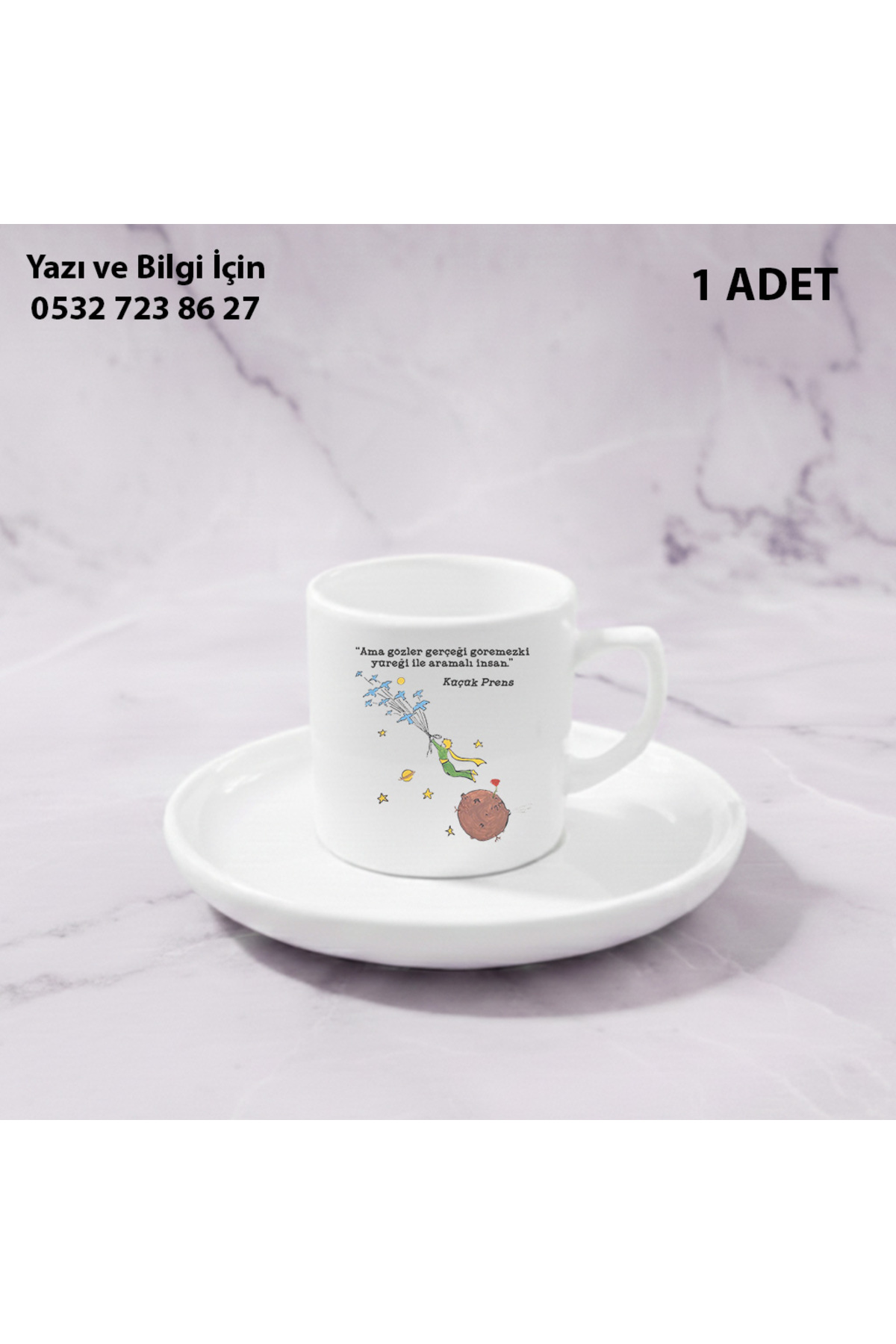– Hayvan desenleriyle süslenmiş, şirin ve eğlenceli bir tasarıma sahip olan Küçük Prens kupa bardak, kahve veya çay keyfinizi renklendirir Yüksek kaliteli porselen malzemesi sayesinde uzun ömürlü kullanım sunar ve dayanıklılığı ile öne çıkar.; Modern tasarımı, günlük kullanım için şık ve zamansız bir görünüm sağlar.; – Küçük Prens temalı tasarımıyla çocukların ve yetişkinlerin beğenisine sunulan bu Türk kahvesi fincanı, 100 ml hacmiyle ideal kahve keyfi sağlar.; – Gıda temasında güvenliği garanti eden sembolü ile hazırlanan bu fincan, hem sağlıklı hem de şık bir sunum imkanı sunar.; – Bulaşık makinesinde rahatlıkla yıkanabilme özelliği sayesinde pratik kullanım sağlar ve hijyenik bir deneyim sunar.; – Tek parça olarak gelen bu seramik fincan, minimalist ve sade tasarımıyla dikkat çekerken, dayanıklılığı ile uzun süreli kullanım vaat eder.; – TR menşei garantisiyle yerli üretim kalitesini sofralarınıza taşır ve ekonomik bir tercih olanağı sunar.; – Doğum günü temalı stiliyle özel günlerde sevdiklerinize anlamlı bir hediye alternatifi olarak öne çıkar.; – Her sipariş kişiye özel basılmaktadır.; Sipariş verdikten sonra sipariş numaranız ile birlikte bizlere basılacak bilgiler iletmeniz gerekmektedir.; – Sipariş numarası ile iletilmeyen baskılar isimsiz olarak basılacak gönderilecektir.; – Kişiye özel ürünlerde ve değişim hakkı bulunmamaktadır.; Hukuki olarak iadesi mümkün olmayan ürünler sınıfına girmektedir.; – Ürün Sayfasında Bulunan Son Görseldeki Şekilde İsim Bilgilerinizi İletebilirsiniz.; İsim Bilgisi iletilmeyen siparişler isimsiz görselde göründüğü şekilde baskılı şekilde gönderilecektir.; – Bu Durumda ve değişim kabul edilmeyecektir.;